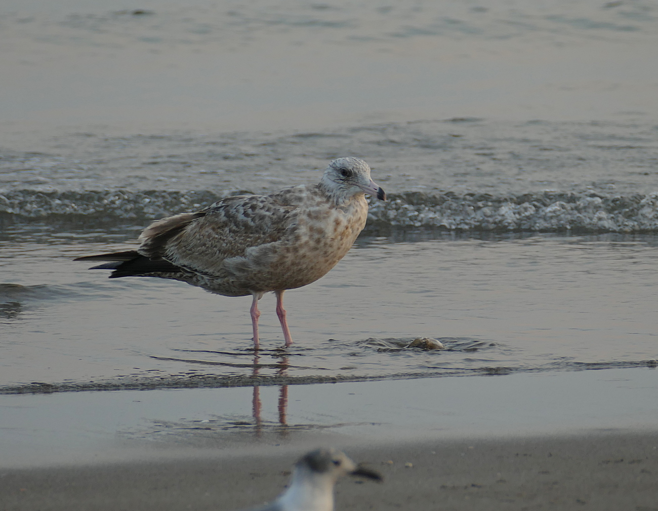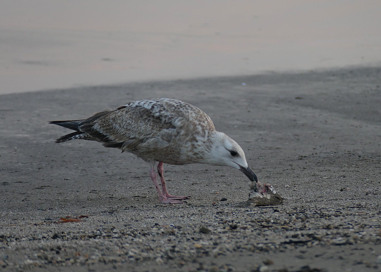 Beskrivelse: Selv om Brown Pelican er kendt for at styrtdykke efter fisk, som en anden sule, er den dog også opportunistisk nok til at snuppe et nemt måltid på stranden.