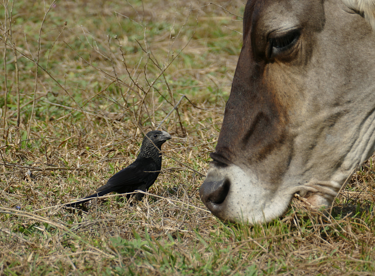 Beskrivelse: Sjovt at opleve Groove-billed Ani søge føde mellem de græssende kreaturer, som en anden Kohejre, hvor den holdt øje med, om insekter og andet skravl blev jaget op af det store dyr.