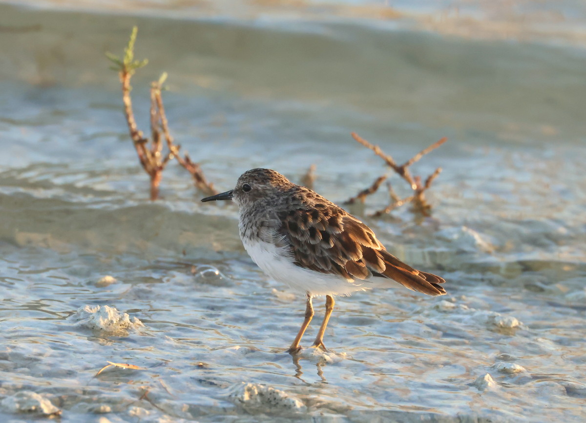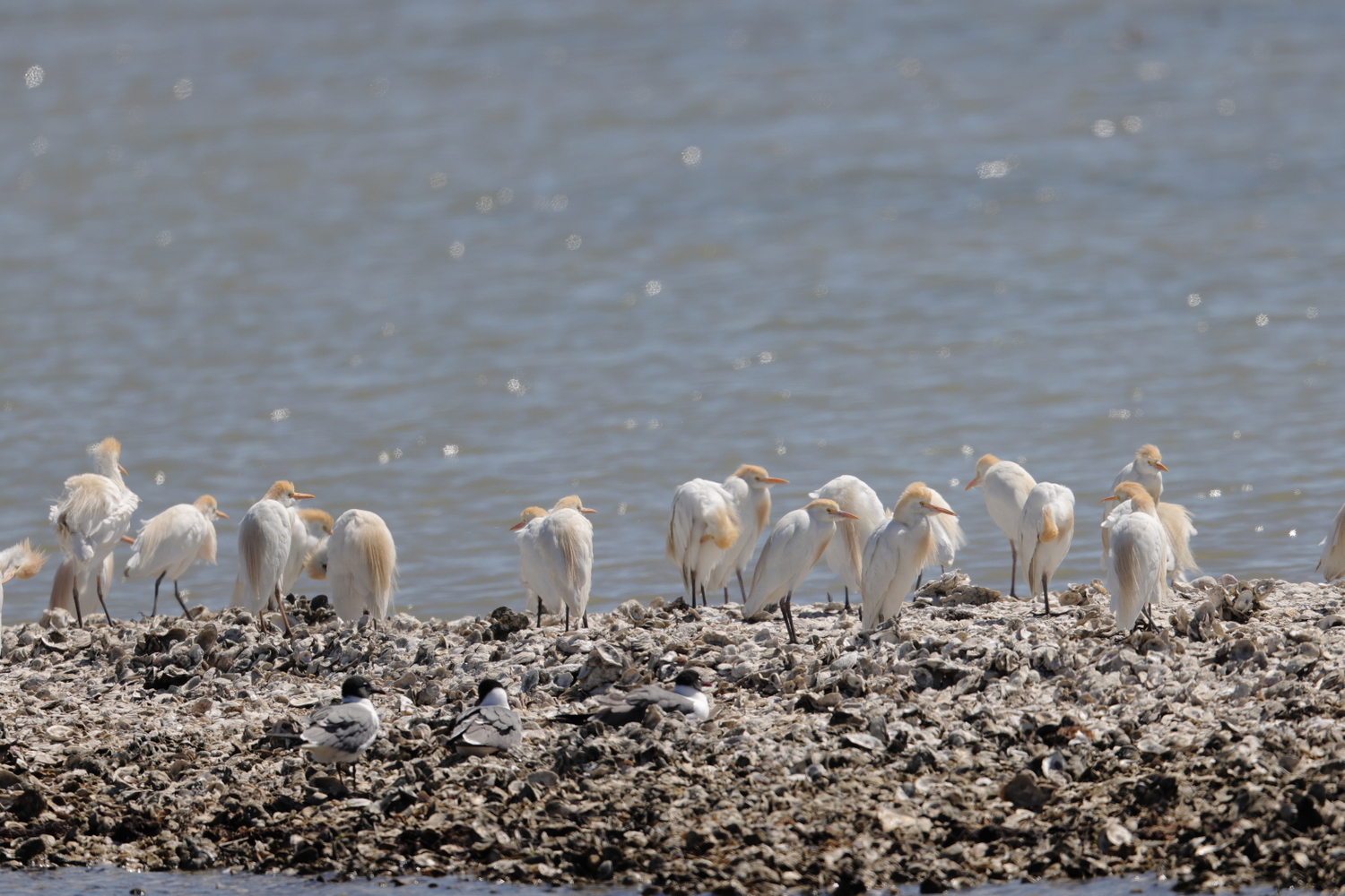 Titel: The Cattle egret is very opportunistic in choice of nature type and food. It expands rapidly in the US. Here at an Oyster bank on the Texas coast.