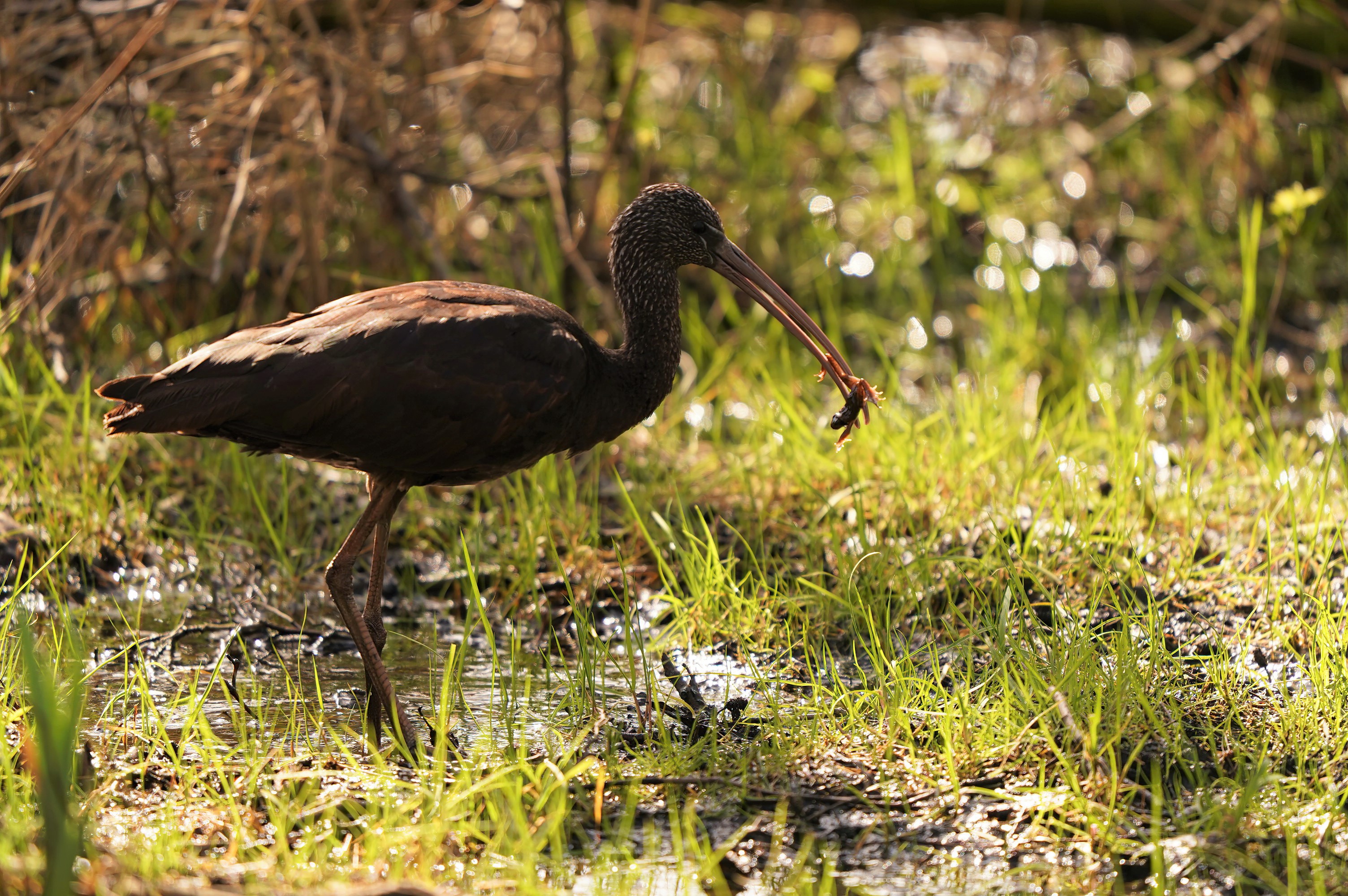 Beskrivelse: Sort ibis søger føde i det lave vand på engen